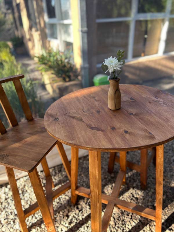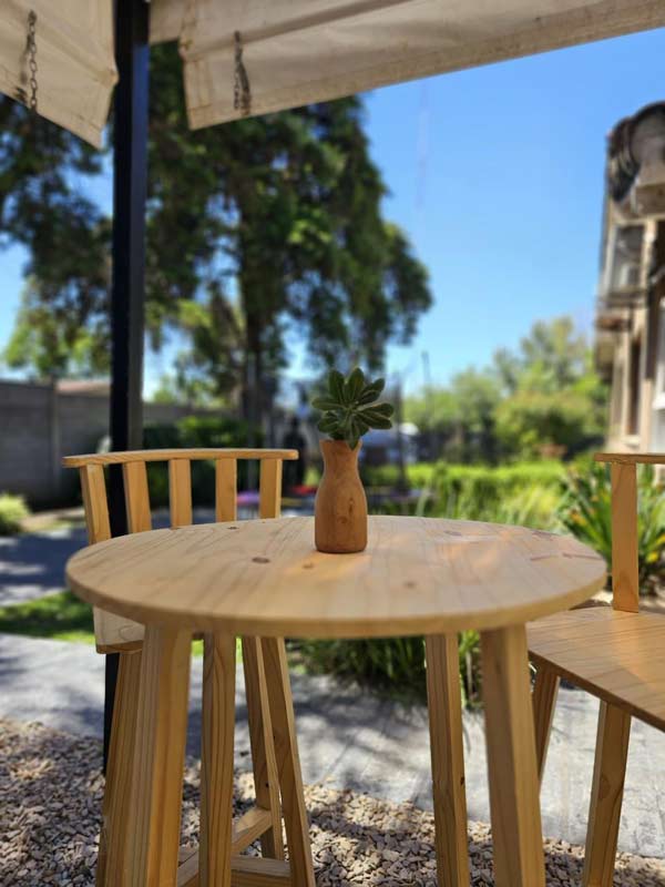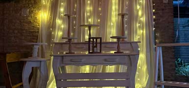 - Mesas de Candy Bar con accesorios (telón blanco, fondo madera)
